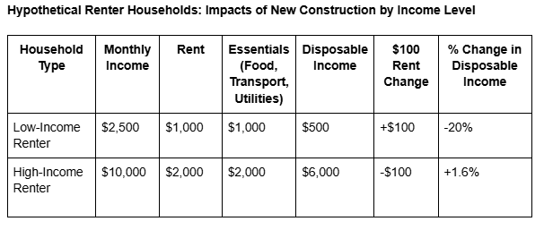 Although the submarket rent increase finding is not yet fully confirmed, it is worthwhile to explore the implications of it being true. While treated as something of a curiosity in housing economics research, I would argue the finding from the Minneapolis study should actually be central to policy decisions around development if confirmed. The reason is that the welfare impacts of even modest changes in rent for low-income households tend to be much more significant than any impact on wealthier households, in relation to household income and especially disposable income.